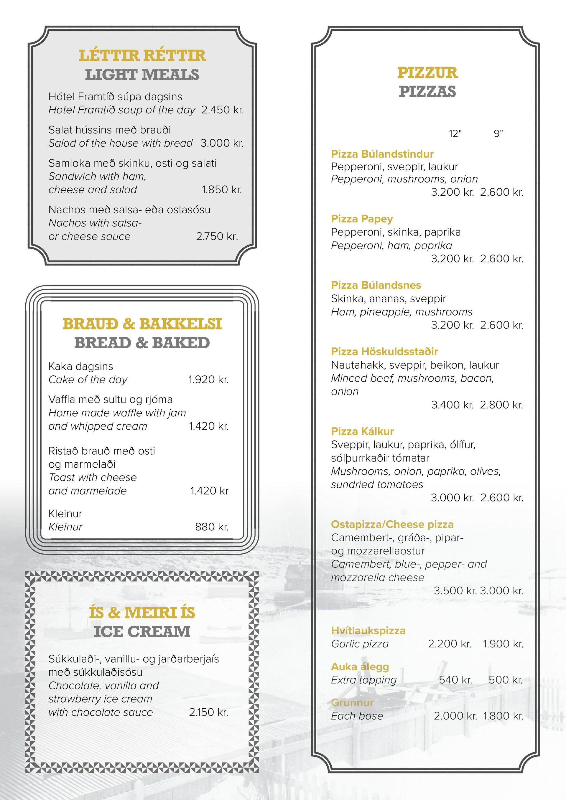 Veitingastaðinn má finna í upprunalegu hótelbyggingunni, Framtíð. Húsið var byggð veturinn 1905-06 og enduspegjar vel sjarma og karakter þorpsins.